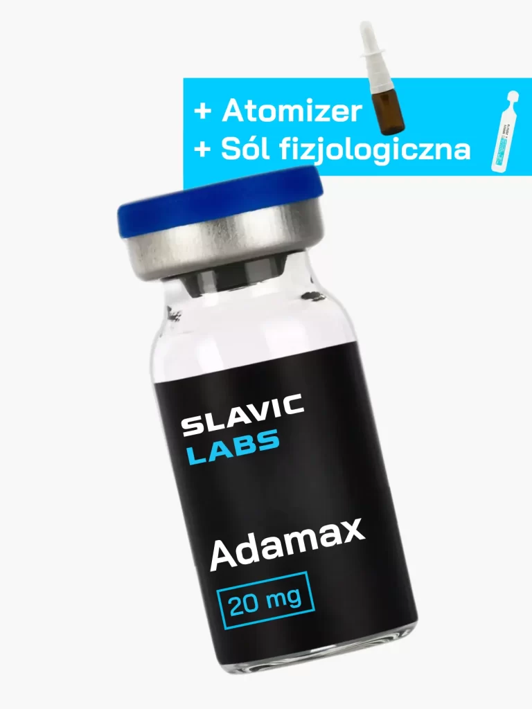 Przykład: Aby uzyskać dawkę około 0,45mg do badań, należy rozpuścić 20 mg Adamaxu w 5 ml soli fizjologicznej. Następnie jedno naciśnięcie atomizera („psik”) zawiera ilość peptydu wynoszącą około 0,45mg. Badać 1-2 “psiki” dziennie.