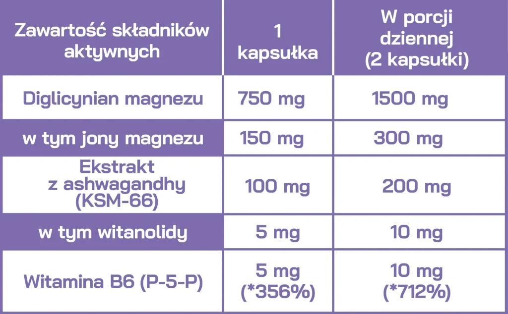 Diglicynian magnezu (magnez);ekstrakt z korzenia witanii ospałej KSM-66 (Withania somnifera); witamina B6, kapsułka: hydroksypropylometyloceluloza;